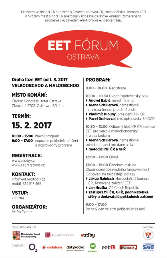Tematicky se konference konaná v Ostravě 15. února 2017 zaměřuje na otázky spojené s druhou fází zavedení EET, která startuje 1. března 2017. V první řadě je tedy určena subjektům podnikajícím v oblasti velko a maloobchodu a kromě odborného programu nabídne také prezentaci dodavatelů technologických řešení pro EET.