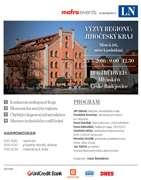 Mediální skupina MAFRA připravuje na středu 25. května 2016 konferenci „Jihočeský kraj – Místo k žití, místo k podnikání“. Uskuteční se od 9:00 do 12:30 hodin v Hotelu Budweis v Českých Budějovicích (Mlýnská 6, České Budějovice). Partnerem akce je také Svaz.
