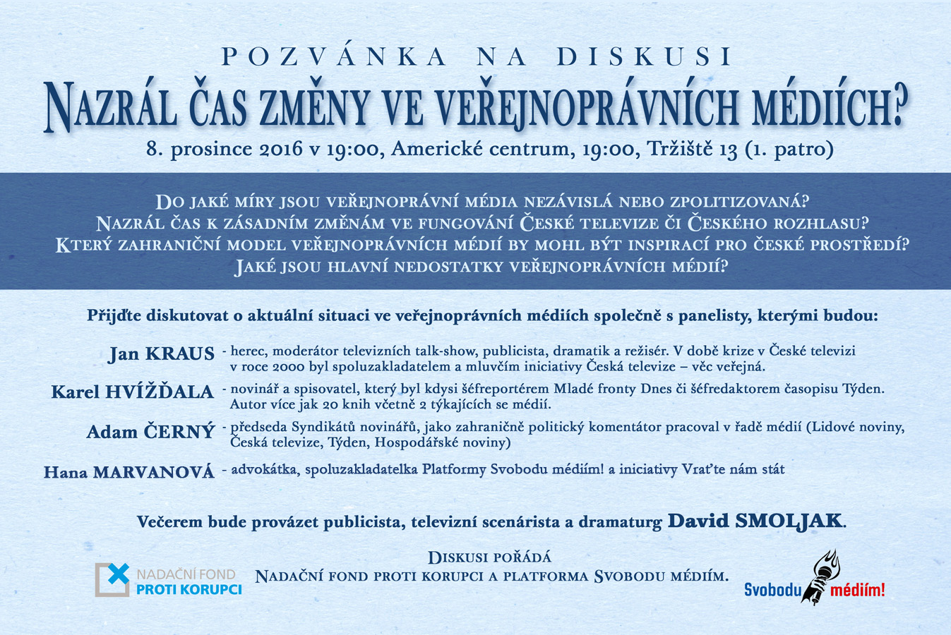 Zveme na konferenci s názvem „Nazrál čas změny ve veřejnoprávních médiích?,“ která se uskuteční ve čtvrtek 8.12. 2016 od 19:00 v Americkém centru.