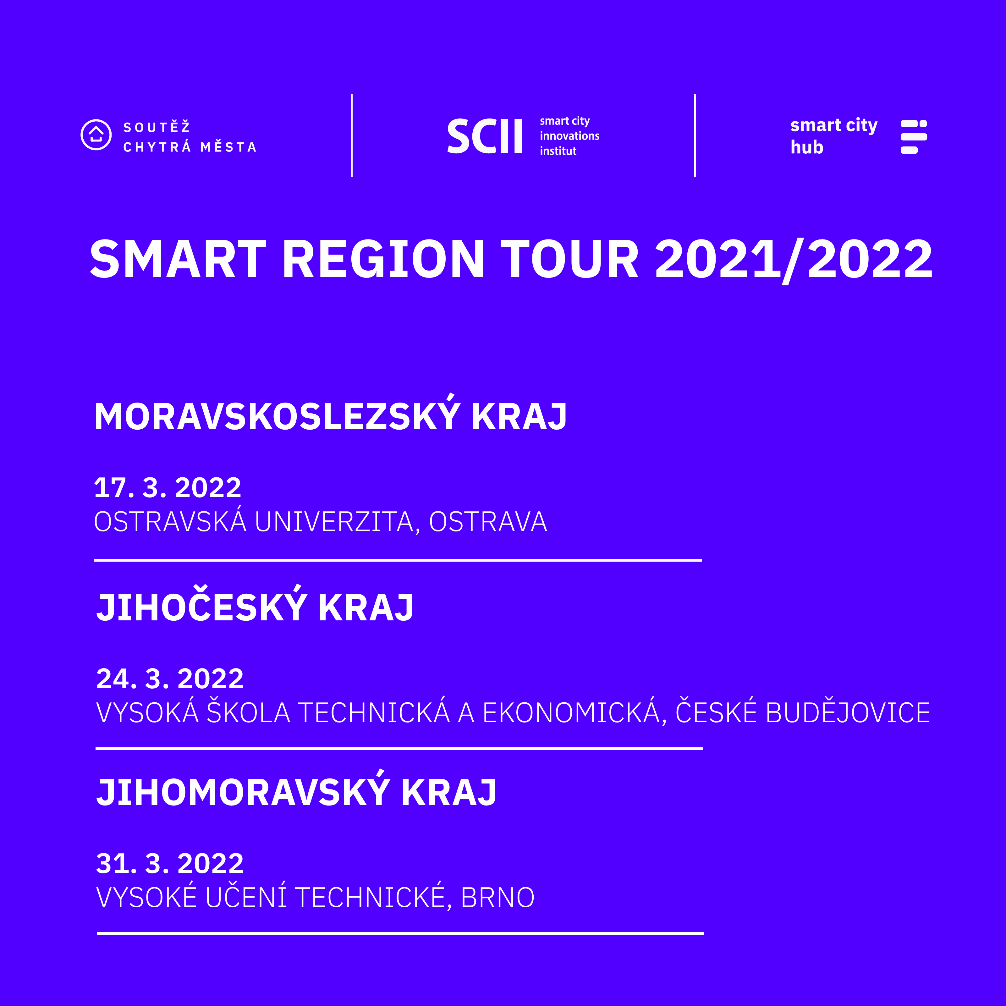 - Smart Region Tour v Moravskoslezském kraji – 17. 3. 2022, Aula Ostravské univerzity na adrese Českobratrská 16, Ostrava