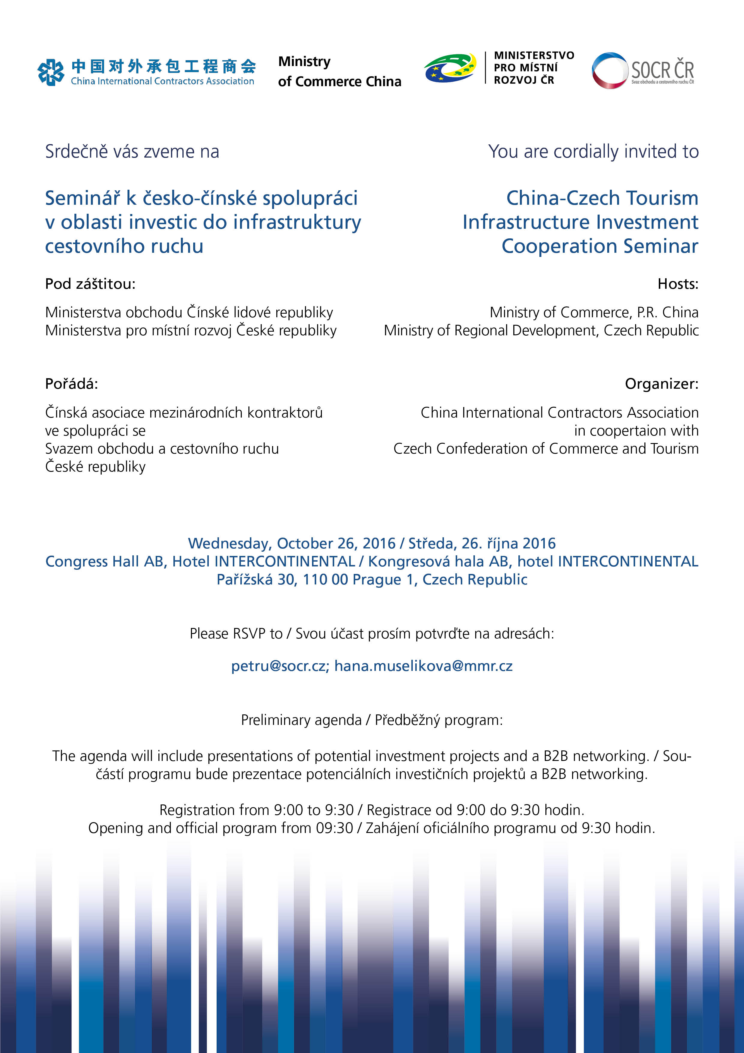 Zveme vás na Seminář k Česko-čínské spolupráci v oblasti investic do infrastruktury cestovního ruchu. Bližší informace níže v pozvánce. Jedná se o akci, která může sloužit jako prostor pro vzájemné navázání nových vztahů a spolupráce právě v regionech.