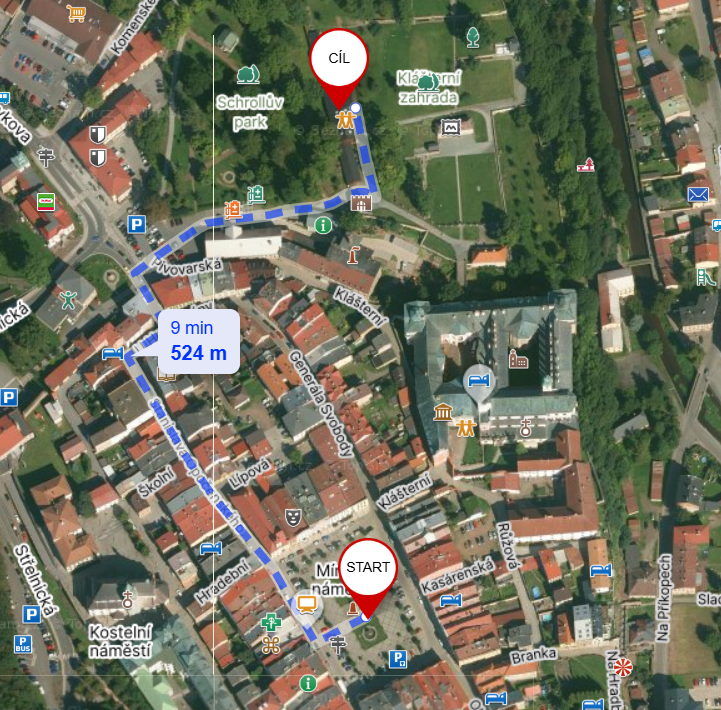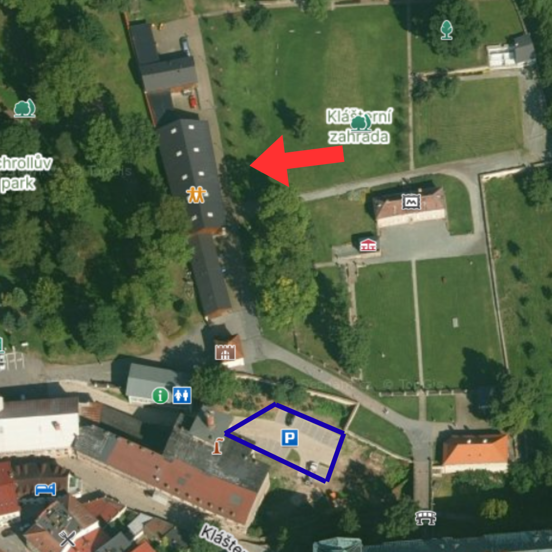 Popis cesty z parkoviště do budovy konání: Vydejte se rovně ulicí Stanislava Opočenského. Po zhruba 250 metrech ulice končí, následně zahněte doprava do ulice U Horní brány. Následně se vydejte první odbočkou vlevo do ulice Pivovarská. Poté zahněte doprava a jděte skrz parkoviště a následně podél parku až do klášterní zahrady. Následně zahněte doleva a po 50 metrech dorazíte do cíle.
