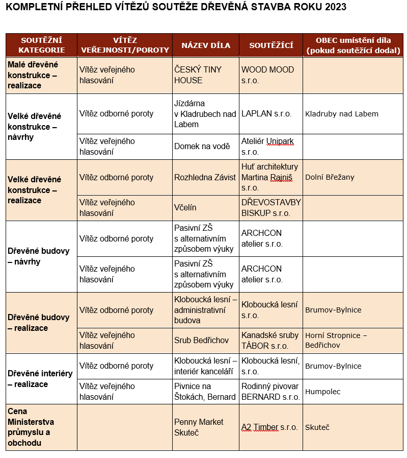 Prestižní oborová soutěž Dřevěná stavba roku, kterou již 13. rokem organizuje Nadace dřevo pro život, zná své letošní vítěze. Oceněno bylo dvanáct realizací či návrhů, podle hlasů veřejnosti i odborné poroty. Nejvíce ocenění si letos odnesly projekty Kloboucká lesní – administrativní budova a návrh Pasivní ZŠ s alternativním způsobem výuky. Do ročníku 2023 bylo přihlášeno 82 soutěžních děl, napříč šesti soutěžními kategoriemi. Slavnostní vyhlášení soutěže Dřevěná stavba roku 2023 se konalo 20. dubna v Praze. Přehled vítězů i s kompletní fotodokumentací k projektům je k dispozici na stránkách Nadace dřevo pro život.