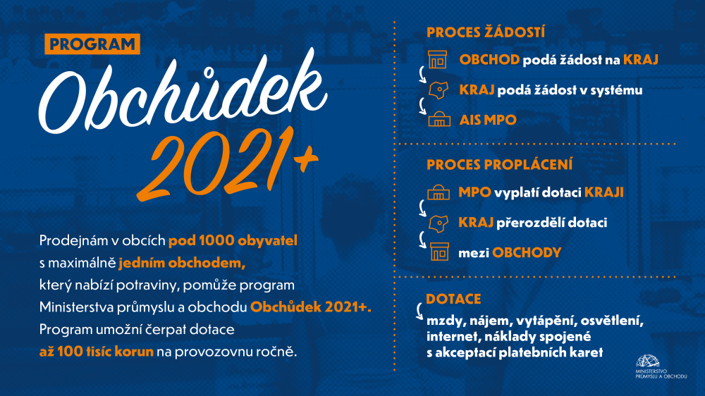 Od 4. srpna až do 29. října 2021 mohou kraje žádat o podporu z programu Obchůdek 2021+. Provozovatelé prodejen s potravinami a smíšeným zbožím v obcích do 1 000 obyvatel, resp. do 3 000 obyvatel, kdy v jednotlivých částech obce nežije víc než 1 000 lidí, v něm budou moci dostat finanční podporu na provoz až 100 000 Kč.