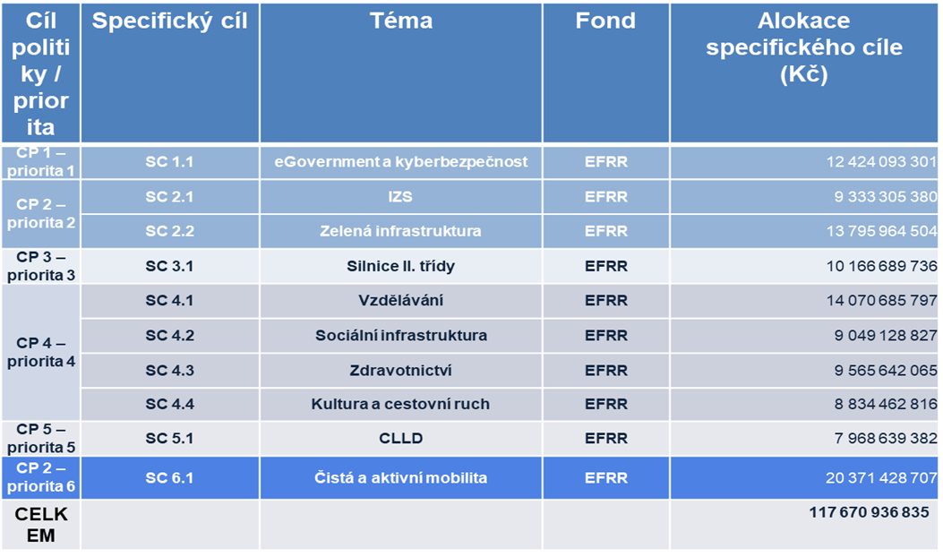 Přehled Specifických cílů IROP 2021-2027 a alokací