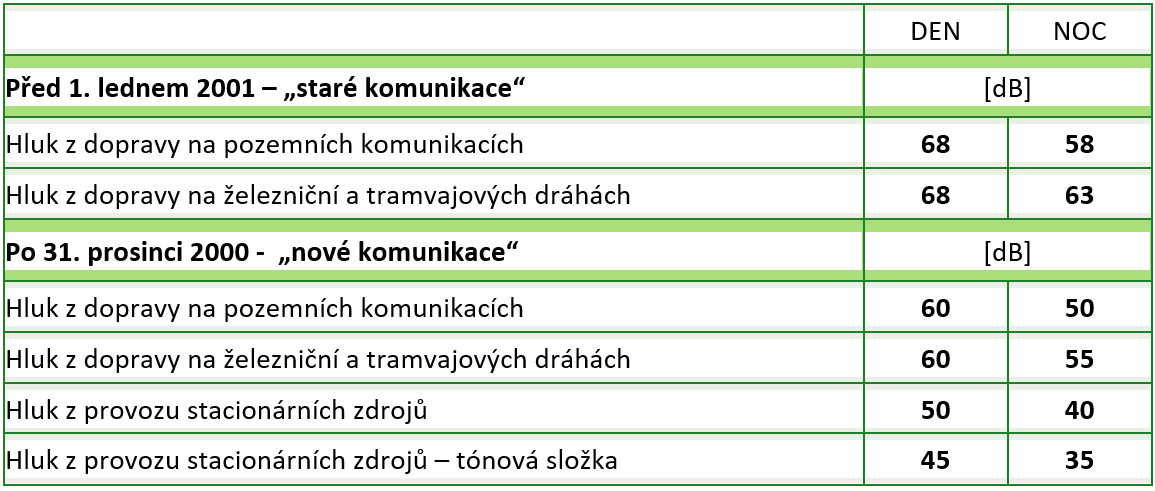V případě uznání starých hlukových zátěži odpovídal jejich hygienický limit hodnotě 70/60 dB v denní/noční době, a to jak pro dálnice, silnice I a II třídy, ale i silnice III třídy včetně účelových komunikací. Uznávání starých hlukových zátěží se s ohledem na nedostatek „tvrdých“ dat před rozhodným datem stávalo formalistickým. Novelou NV bylo MZDR navrženo rozdělení hygienických limitu podle rozhodného data 1. 1. 2001 na „staré“ komunikace s hygienickými limity 65/ 55 dB pro denní/noční dobu, a „nové“ komunikace s hygienickými limity 60/50 dB pro denní/noční dobu. U „nových“ komunikací se tedy nic nemění, neboť zde platí že komunikace budované po 1.1. 2021 musí splňovat tyto limity již dnes. V rámci připomínkového řízení uplatnily zásadní připomínky k limitům u „starých“ komunikací Hospodářská komora a Ministerstvo životního prostředí. Na základě následujících jednání v rámci vypořádání připomínek došlo ke kompromisu u „starých“ komunikací na hodnotě 68/58 dB pro denní/noční dobu.