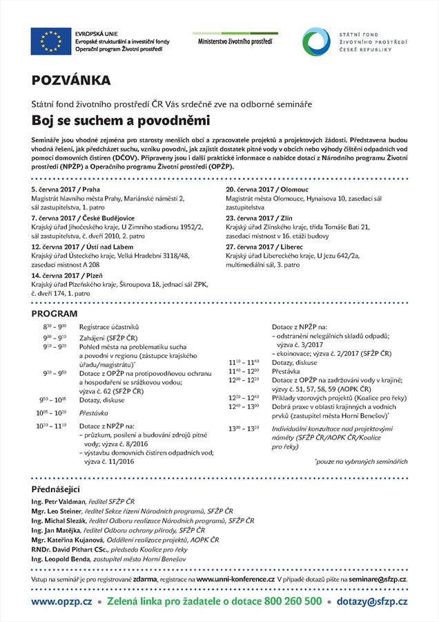 Novou sérii seminářů zaměřených na boj se suchem a povodněmi připravilo Ministerstvo životního prostředí spolu se Státním fondem životního prostředí ČR. První ze sedmi půldenních seminářů se uskuteční 5. června v Praze a poslední 27. června v Liberci. Určeny jsou starostům i zástupcům městských či obecních úřadů. Semináře představí vhodná řešení, jak předcházet suchu, vzniku povodní, jak zajistit dostatek pitné vody v obcích nebo výhody čištění odpadních vod pomocí domovních čistíren. Připraveny jsou i další praktické informace o nabídce dotací z Národního programu Životní prostředí a Operačního programu Životní prostředí.