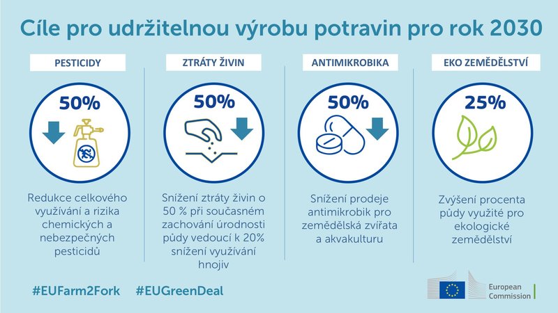 V květnu 2020 byla zveřejněna Strategie od zemědělce ke spotřebiteli, která se snaží o komplexní přístup k výrobě a spotřebě potravin pro budoucí udržitelnost života. Cílem strategie je omezení používání syntetických hnojiv do roku 2030 o pětinu a omezení pesticidů o 50 %. Rozšířit by se naopak mělo ekologické zemědělství, aby se ekologicky hospodařilo minimálně na čtvrtině zemědělské půdy. Snížit se má navíc prodej antibiotik určených pro hospodářská zvířata, a to až do 50 %. Evropská komise chce také pomoci zkracování dodavatelských řetězců, které přispívají k emisím skleníkových plynů a znečištění ovzduší.