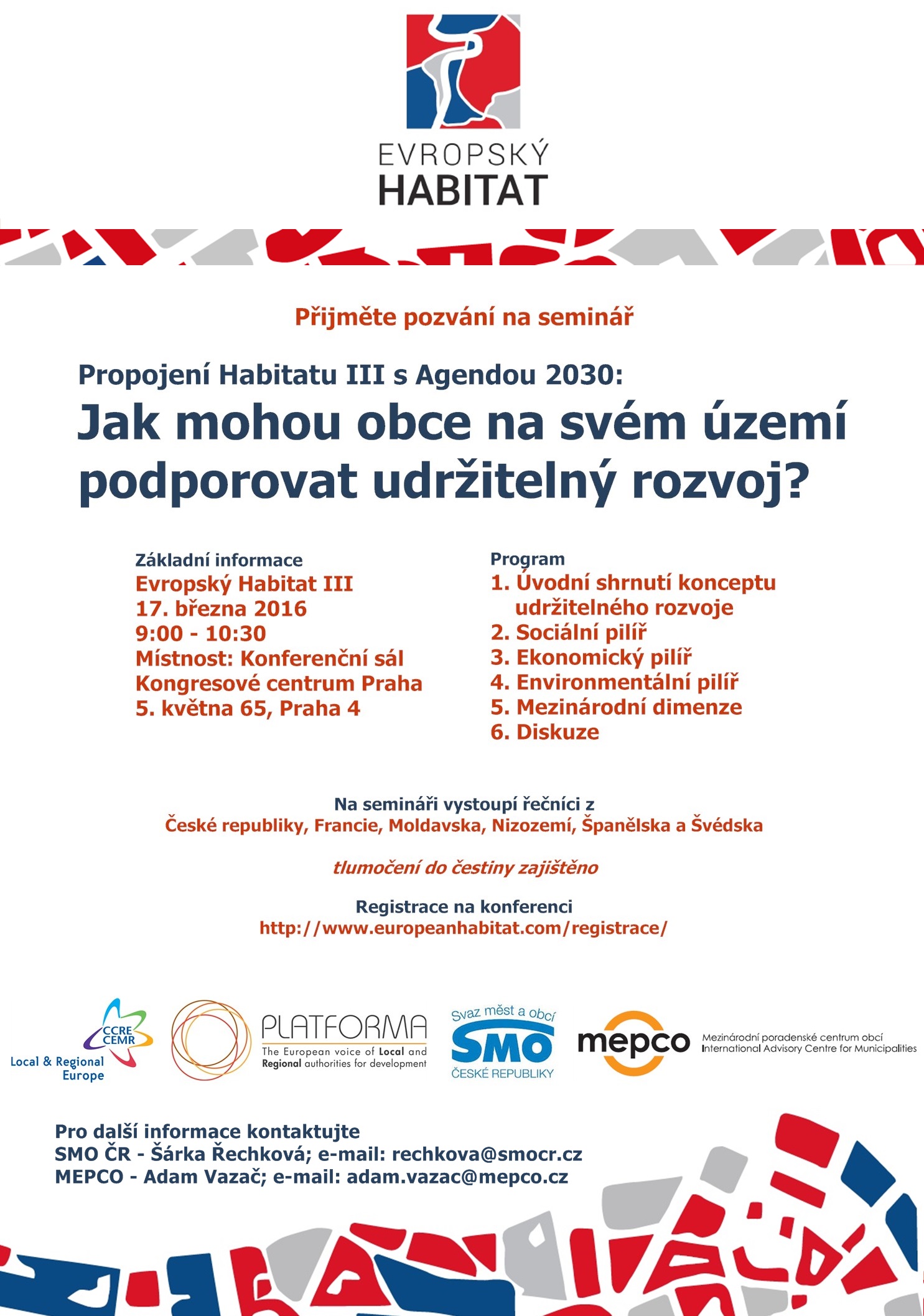 Ve čtvrtek 17. března 2016 se uskuteční seminář „Jak mohou obce na svém území podporovat udržitelný rozvoj?“. V rámci Evropského Habitatu ho pořádá Svaz měst a obcí ČR ve spolupráci s Radou Evropských obcí a regionů (CEMR) a Platformou v Kongresovém centru Praha.