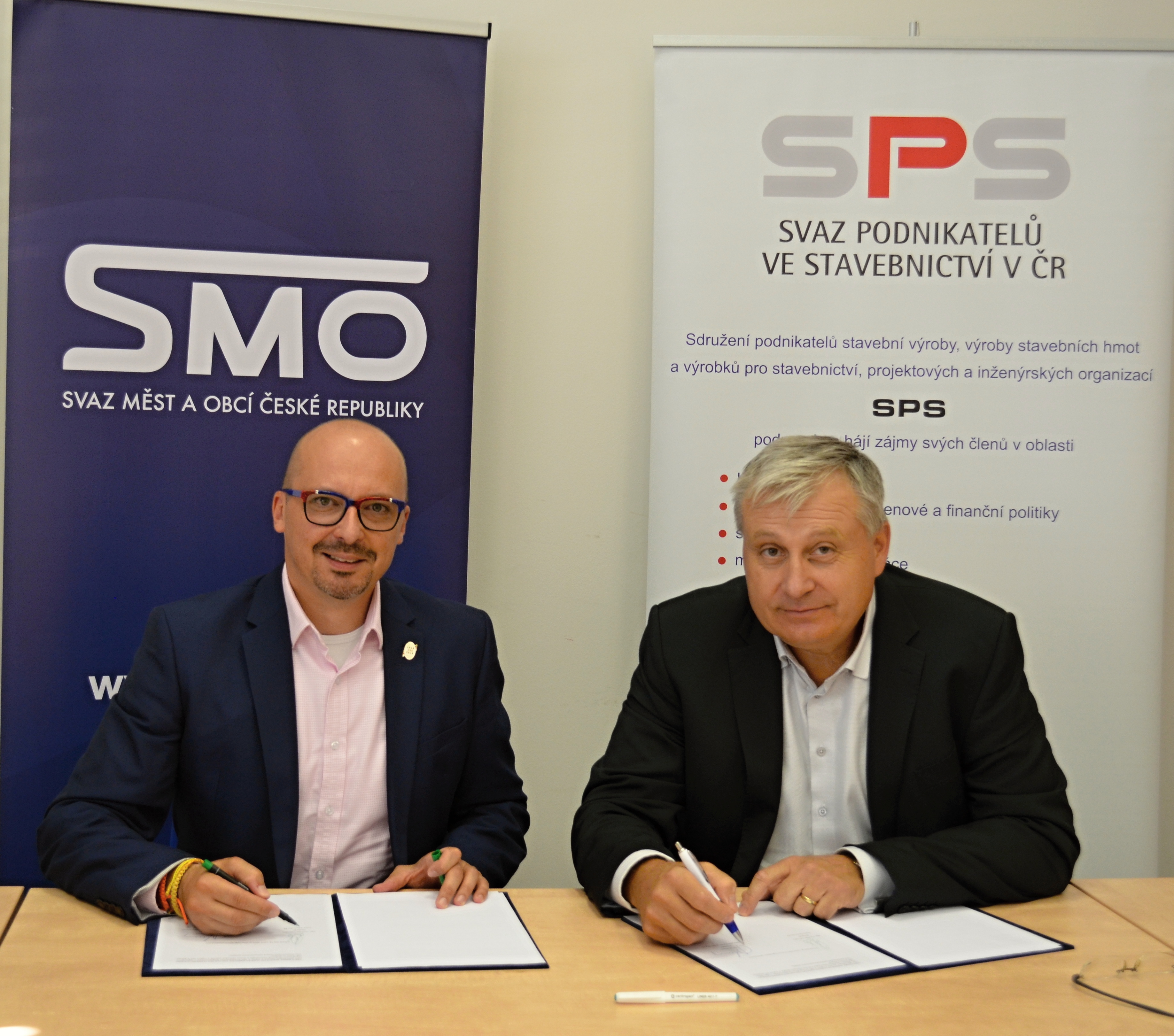 Praha, 18. srpna 2020. Svaz měst a obcí ČR a Svaz podnikatelů ve stavebnictví budou spolupracovat na podpoře bytové výstavby nebo investic do stavebnictví. V sídle Svazu měst a obcí České republiky (SMO ČR) na Vyšehradě se sešli předseda Svazu a starosta Kyjova František Lukl a prezident Svazu podnikatelů ve stavebnictví (SPS) Jiří Nouza. Cílem setkání bylo slavnostní podepsání memoranda o vzájemné spolupráci.