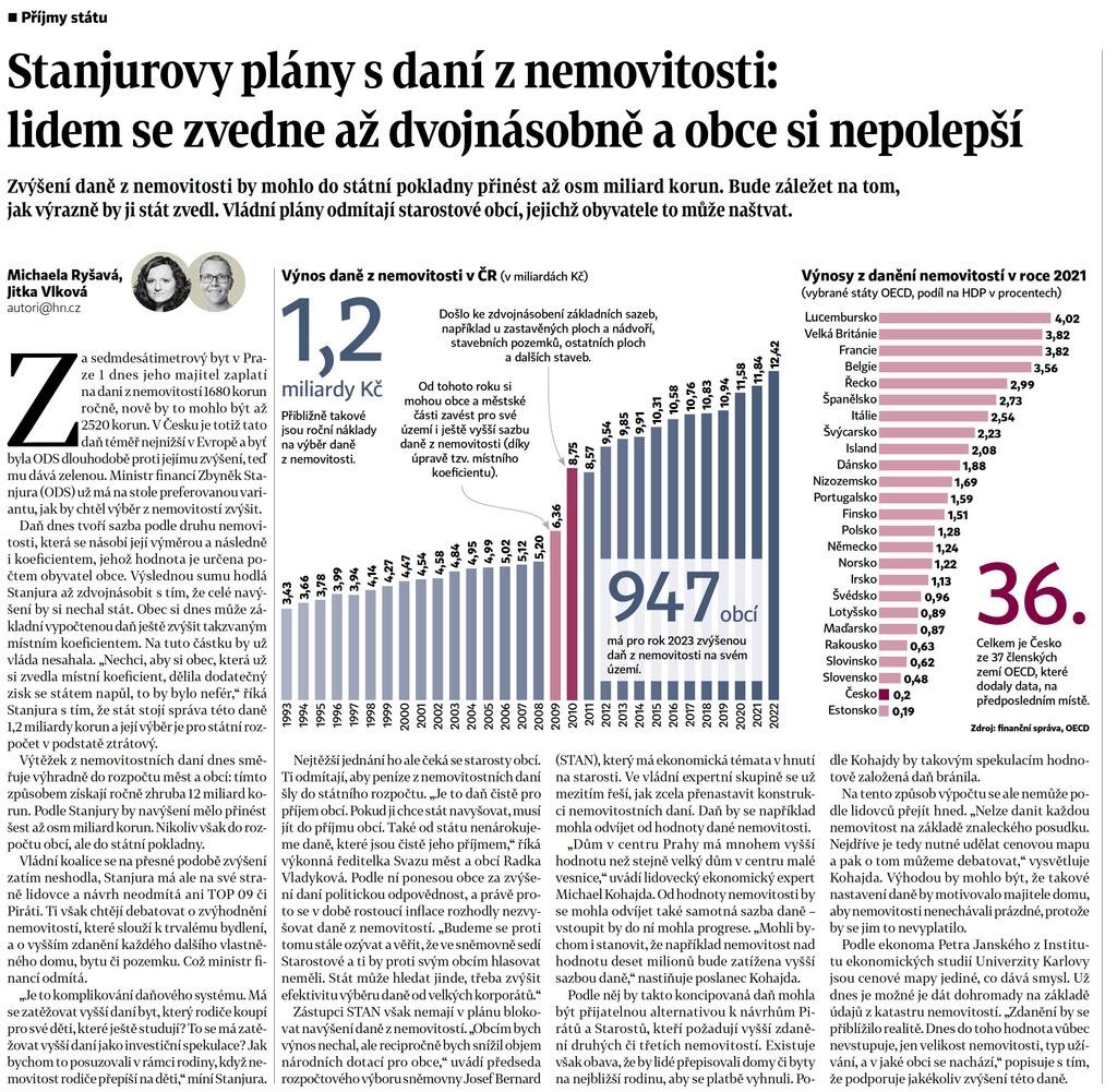 „Nechci, aby si obec, která už si zvedla místní koeficient, dělila dodatečný zisk se státem napůl, to by bylo nefér,“ říká Stanjura s tím, že stát stojí správa této daně 1,2 miliardy korun a její výběr je pro státní rozpočet v podstatě ztrátový. Výtěžek z nemovitostních daní dnes směřuje výhradně do rozpočtu měst a obcí: tímto způsobem získají ročně zhruba 12 miliard korun. Podle Stanjury by navýšení mělo přinést šest až osm miliard korun. Nikoliv však do rozpočtu obcí, ale do státní pokladny. Vládní koalice se na přesné podobě zvýšení zatím neshodla, Stanjura má ale na své straně lidovce a návrh neodmítá ani TOP 09 či Piráti. Ti však chtějí debatovat o zvýhodnění nemovitostí, které slouží k trvalému bydlení, a o vyšším zdanění každého dalšího vlastněného domu, bytu či pozemku. Což ministr financí odmítá.