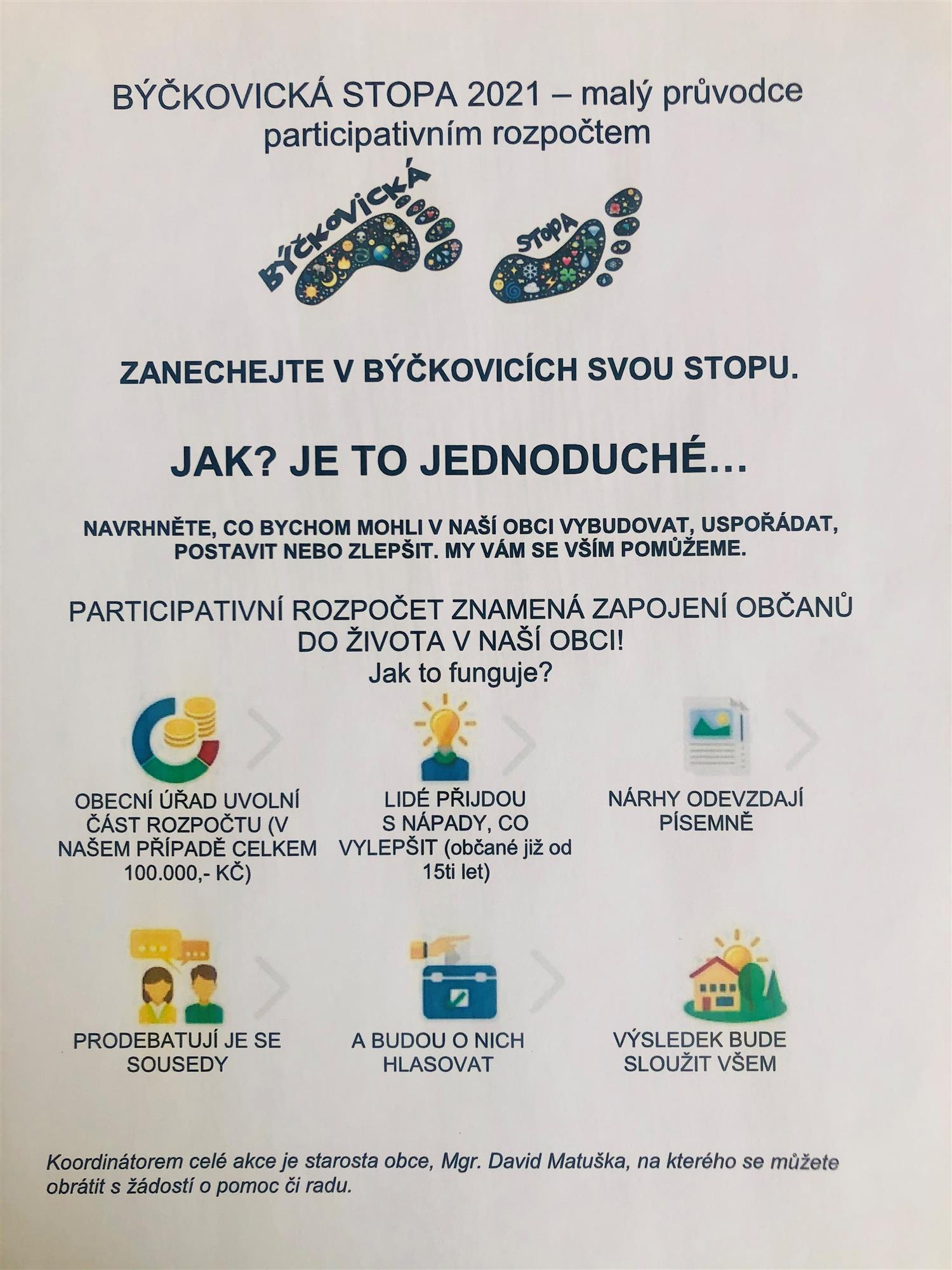 Naučit se metodiku zpracování projektů od analýzy, přes studii až po realizaci, příklady dobré praxe či způsoby a možnosti financování jsou hlavními cíli účasti starosty Býčkovic Davida Matušky. „Pro naši obec čítající 300 obyvatel je nutná finanční podpora a spoluúčast pro většinu realizovaných projektů,“ říká starosta Matuška.